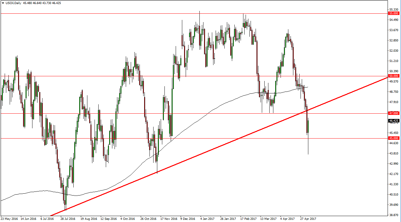 The WTI Crude Oil market broke down significantly during the session on Friday, slicing through the $45 level. That’s an area that of course caused a bit of support due to the fact that it is a large, round, psychologically significant number, but this had more to do with the jobs number being stronger than anticipated. In theory, this suggests that there should be plenty of demand due to industrial consumption, but quite frankly I think that longer term we still have a lot of issues. The market breaking below the $47 level and of course the uptrend line should continue to offer resistance above, so I’m waiting to see and exhaustive candles that I can start selling. The signs of the candle during the Friday session was impressive, but quite frankly, after that massive breakdown it’s not that surprising that we would get a snap back.