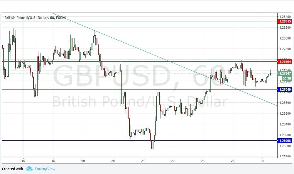 Yesterday’s signals could have produced valid long and short trade entries from both nearby support and resistance levels. This indicates it might be best to hedge and trade the next breakout from the range 1.2700 to 1.2756. I have a slight bullish bias so a long from 1.2705 may work out better than a short from 1.2756. However, the Bank of England’s key release later today is likely to create volatility which will run any nearby stops.