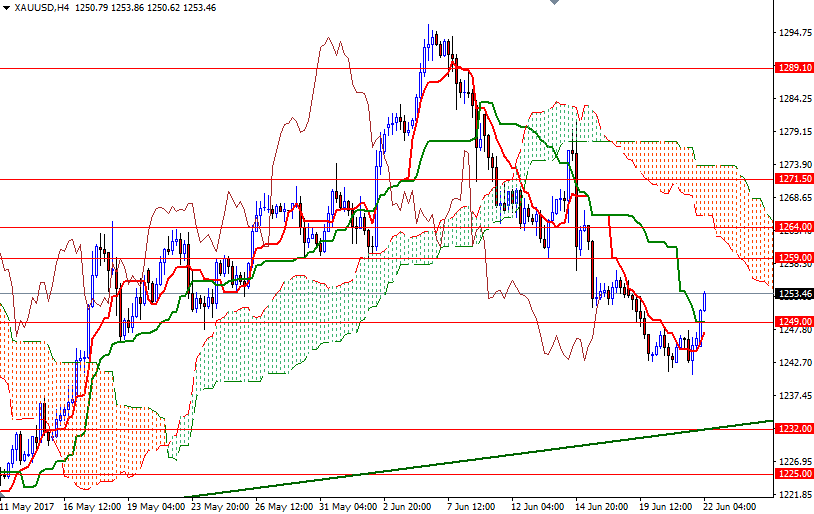 This reaction pushed prices above the Ichimoku cloud on the hourly chart but it seems that the market is stalling near the 1254 level, which represents the 23.6% retracement of the fall from 1296 to 1240.70. Although holding the initial key support above 1240 (the top of the weekly cloud) is a positive sign, prices are still below the cloud on the 4-hour chart, and XAU/USD has to penetrate 1254 in order to approach there. If the bulls are able to break through 1260/59, then 1262 and 1264 will be the next targets.