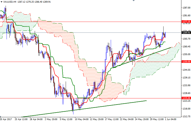 The XAU/USD pair is challenging this barrier again today, but it appears that market players are hesitant to go heavily long ahead of highly anticipated U.S. jobs data. The bulls still have the medium-term technical advantage, with the market trading below the Ichimoku clouds on the weekly and the 4-hourly time frames, but where prices will go in the short-term depends on the outcome of the test of 1271.50-1269.