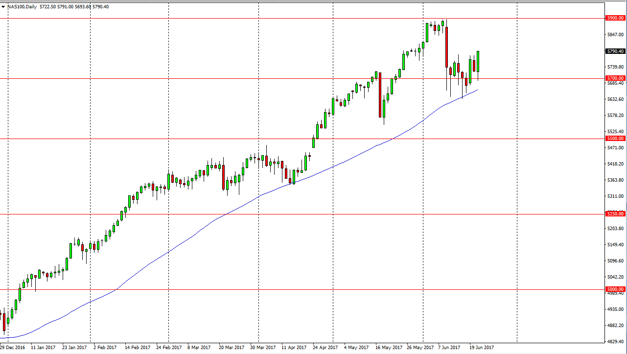 The NASDAQ 100 initially fell but found enough support of the 5700 level to turn around and skyrocket. This is a very strong sign as the 50-day exponential moving average offered enough support to turn things around and it now looks as if we are going to go looking for the 5900 level. I believe the stock indices in general are going to be strong, and eventually we will break above the 5900 level to go looking for the 6000 handle. I think that the 5700 level will offer support, and of course a floor. I believe that the market is a “buy on the dips” type of situation, and will continue to be for the foreseeable future.
