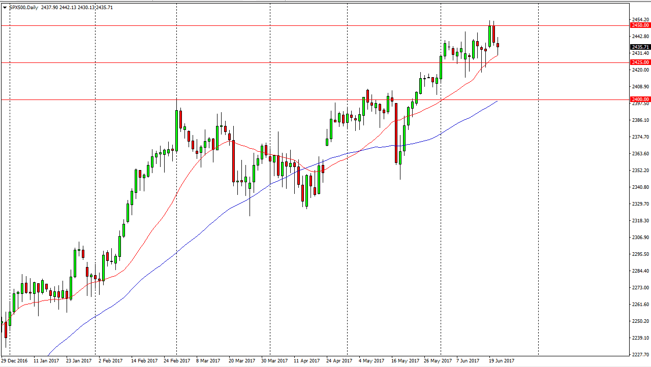 The S&P 500 initially fell during the day but found enough support at the 20-day exponential moving average to turn around to form a hammer. I believe that the stock indices in America look bullish in general, and it appears that towards the end of the day we started to see more buyers enter. We may have had a bit of the selloff, but quite frankly it’s only matter of time before the buyers push this market towards the highs at 2450, and above there to the 2500 level. I believe that buying dips continue to be the way going forward, and I have no interest in shorting. I believe that the market is one that will continue to find buyers, based upon value and overall strength in stock markets worldwide.
