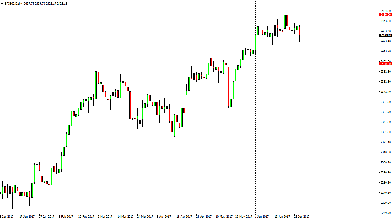 The S&P 500 fell a bit during the day on Tuesday, as we continue to grind sideways. This being the case, looks like we could pull back a little bit and go looking for the 2400 level. The 2400 level underneath should offer plenty of support, thereby an opportunity to pick up a little bit of value. This being the case, I’m looking for a supportive candle underneath to start going long again, and therefore I am going to be very patient as we will need to build up momentum to finally break above the 2450 handle. However, I think that one of the biggest concerns in the stock markets now can be found in the NASDAQ 100.