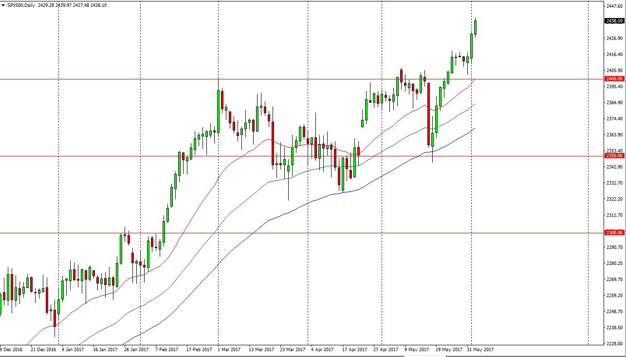 The S&P 500 had a very interesting session on Friday, as we initially sold off, but then exploded to the upside after a very poor jobs report. I find this interesting, and believe that it shows just how bullish the market truly is. The 2450 level above is the first target, and going forward I believe that it’s only a matter of time before the buyers get involved on dips. This 2400 level underneath should continue to offer a bit of a “floor” in this market, and I believe that the markets do continue to reach much higher, perhaps trying to get all the way to the 2500 level. Ultimately, I believe we break above there as well, but in the meantime, I think we will see some volatility from time to time, and I look at pullbacks as an opportunity to buy this very strong market “on the cheap.”