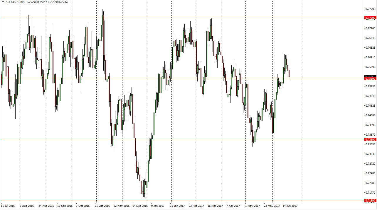 The Australian dollar had a very bullish bounce off the 0.7550 level, after initially falling significantly. The market looks very likely to continue to find buyers underneath. To break above the top of the daily candle should send this market looking for the 0.7625 level above, and eventually higher than that. Once we do breakdown to the upside, this market should go hunting for the 0.7750 level afterwards. Ultimately, this market continues to be very volatile, and if gold could find some type of footing, it could send the Australian dollar higher over the longer-term as well.