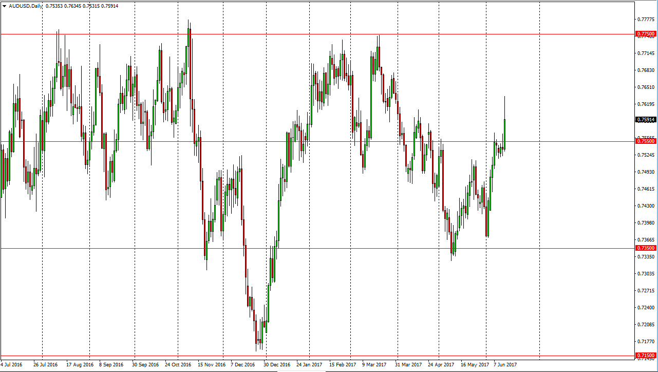 The Australian dollar broke out to the upside, slicing through the 0.7550 level. The market sliced through the 0.6 level at one point, but pulled back slightly. I believe that the market will continue to go higher, but you may have to look to short-term charts to take advantage of this move. The goal markets will have a large effect obviously, and I think that now that the Federal Reserve is done, it’s more than likely going to be a continuation of what we had seen previously. Because of this, I think continuation is in the air, and I’m seen that on several fronts, and this market is just one of them. I think the market can then go to the 0.7750 level, which is my longer-term target ultimately. The 0.75 level underneath needs to be broken in order to start selling, which doesn’t look very likely currently. If we do that though, I think the market should then go down to the 0.7350 level.