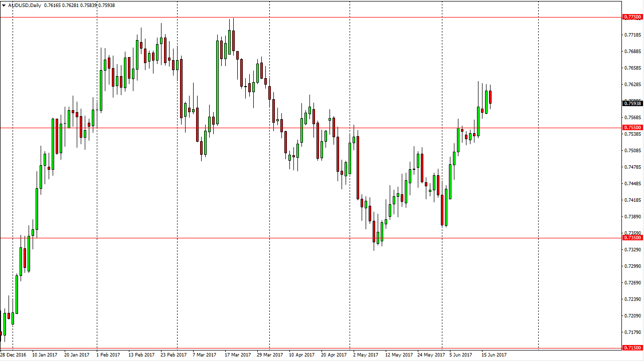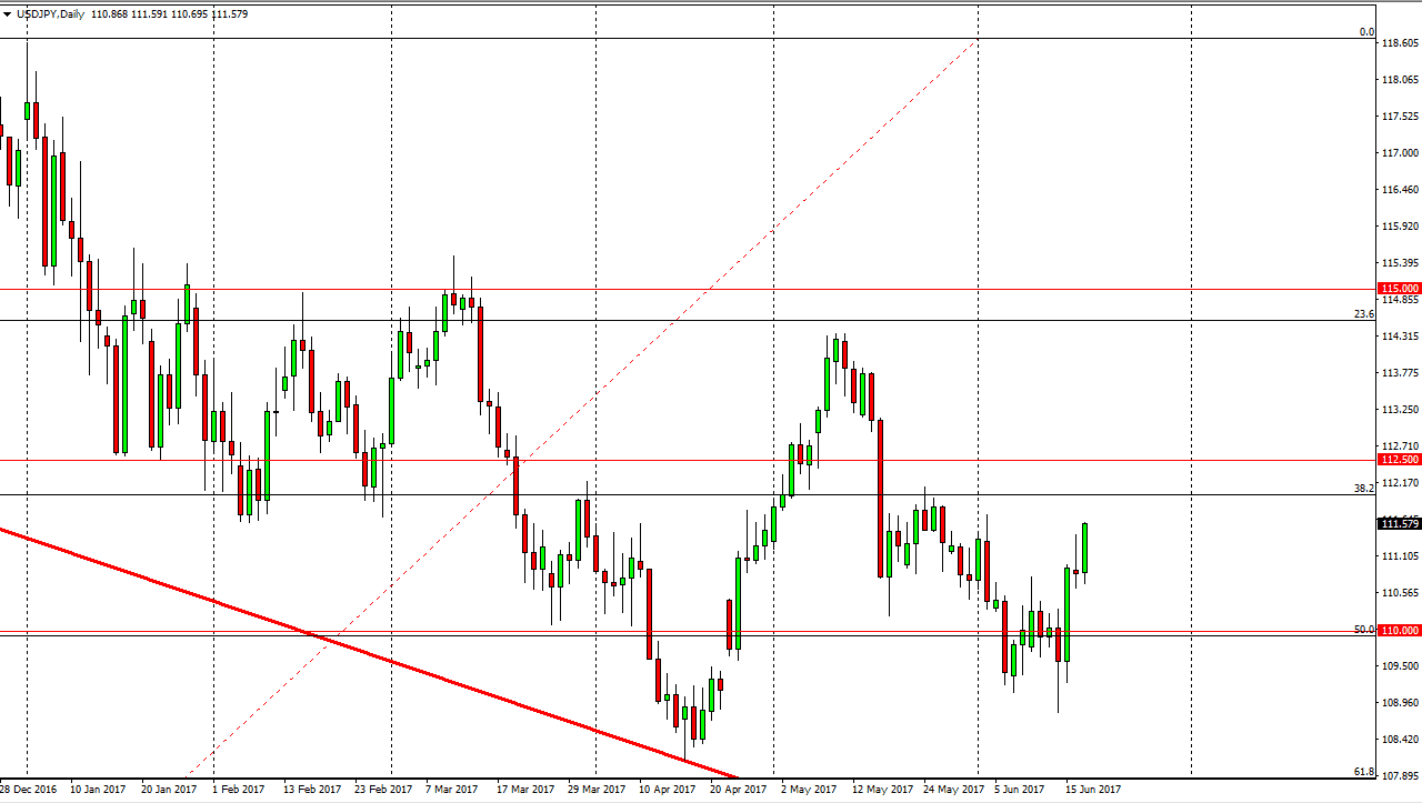 The USD/JPY pair initially dipped on Monday, but broke above the top of the shooting star from the Friday session, and that of course is a very bullish sign. Not only that, we broke above the top of the hammer during the previous week, so I believe that the market should send to the upside, perhaps reaching towards the 112 level, then the 112.50 level. To break above there should send this market reaching towards the 114.50 level next. Ultimately, I believe that the trend is changing in general, so I am very bullish of this pair and believe that short-term pullbacks are buying opportunities, and the higher low suggests that we are starting to see a little bit of a momentum change. Given enough time, I do like the idea of going long, and it makes quite a bit of sense as the Federal Reserve is likely to raise interest rates at least one more time this year.