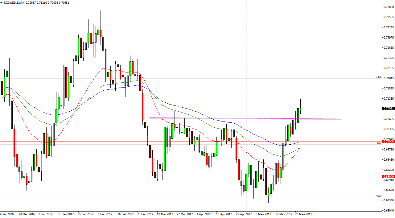 The New Zealand dollar rallied initially during the day but has turned around to form a bit of a shooting star. The 0.71 level looks to be a little bit resistive, so we may get a pullback from here. However, I see a significant amount of support just below that will probably come into play. I think that buying dips will continue to be the way going forward, and it’s not until we break down below the 0.70 level that I would consider selling. Alternately, we can break above the top of the shooting star for the session on Wednesday, and that of course would be a very bullish sign and more than likely will send this market looking for the 0.72 handle after that. Either way, I expect quite a bit of volatility but we have recently broken out and we may need to consolidate a little bit in order to build up a larger position and more importantly, momentum, to continue going to the upside.
