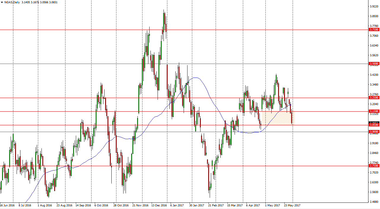 Natural gas markets continue to be very volatile, initially tried to rally during the day on Wednesday but finding the area above the $3.15 level to be too much resistance. The fact that we did then send the market looking to fill the gap, and thereby run down to the 3.05 level. We have done that, so now the question will be whether or not we can bounce. If we break down below the 3.05 level, I think the market will then go fishing towards the $3 handle. Alternately, some type of significant bounce on the short-term chart might be a buying opportunity as this gap in theory should at least hold some type of support. Either way, I think you’re going to get a lot of choppiness and therefore it should be an interesting day to say the least. Natural gas breaking below the $3 level would be very negative on several accounts, and should send this market down to the $2.75 level next.