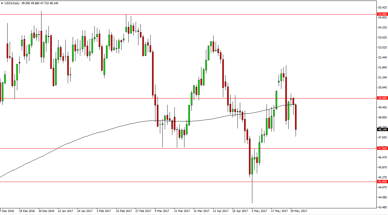 The WTI Crude Oil market had a very negative session on Wednesday as we broke down below the bottom of the range from the Tuesday session, which was a hammer. That hammer of course should have been a very supportive looking move, but the fact that we broke down below and it looks likely that the market will continue to see negative pressure. At this point, I would expect to see the market tried to go down to the $47 level which should be a bit more supportive. A breakdown below there should send this market to the $45 level after that. I still believe that the $50 level above will continue to be resistance, so, I am a seller in general and believe that short-term rallies will be selling opportunities.