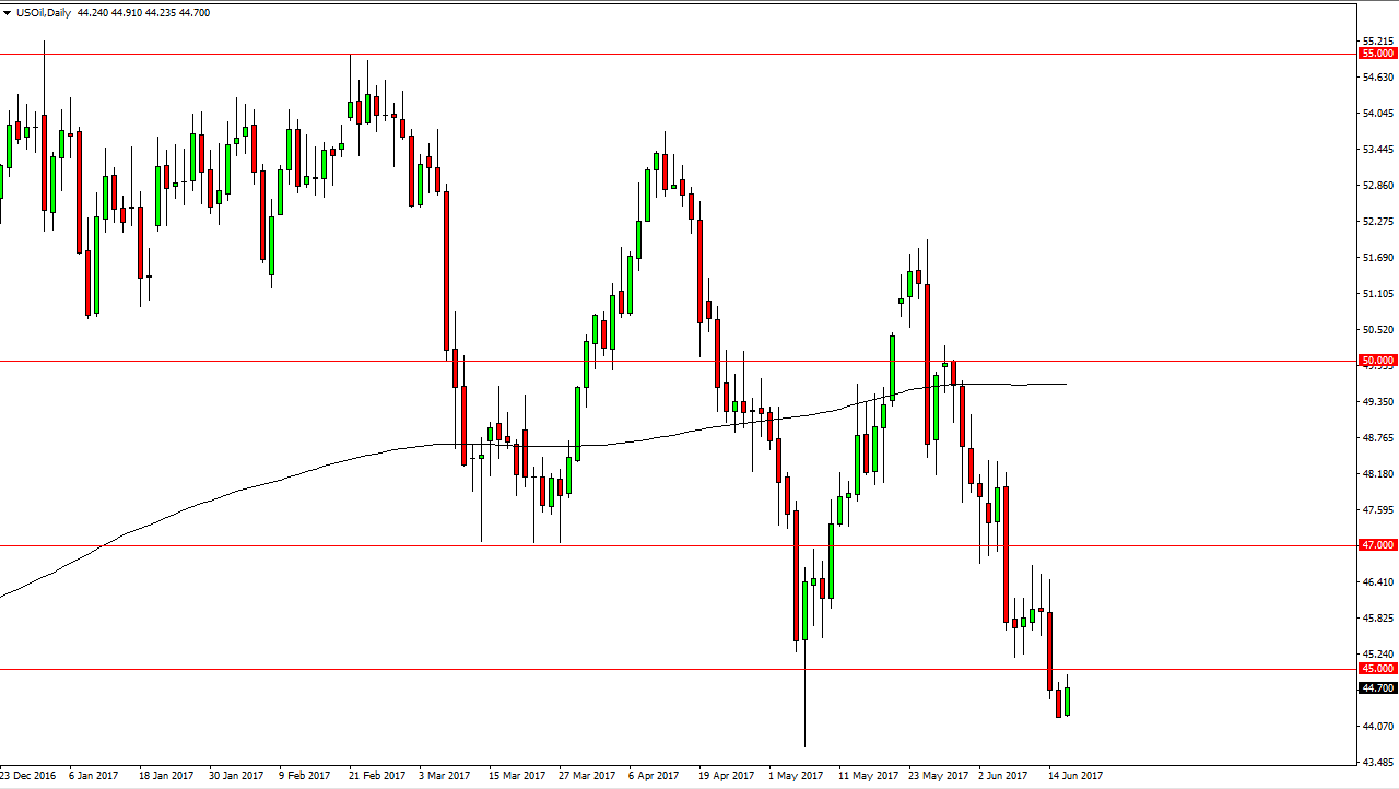 The WTI Crude Oil market bounced during the session on Friday, reaching towards the $45 level above. That is a level that has a certain amount of psychological significance obviously, as it was supportive in the past and of course it’s a large, round, psychologically significant number. If we rally from here, the market will continue to find sellers above, somewhere near the $47 level. An exhaustive candle is exactly what I’m looking forward to start selling, as the market is most certainly bearish in general. I don’t see any reason to try to return to the bullish side of this trade, as it is so bearish in general. Any bounce at this point must be look at as a nice selling opportunity.