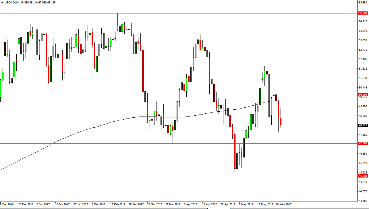 The WTI Crude Oil market initially tried to rally during the day on Thursday, but found enough resistance near the $49.25 level to turn things around and form a very negative looking shooting star like candle. If we can break down below the current area, I believe that we will go looking for the $47 level underneath, and then possibly the $45 level after that. I believe that the market will continue to be one that you can sell as long as we stay below the $51 level. In the meantime, we have a jobs number coming out today which of course will cause volatility in all markets, but I believe that the WTI grade of crude oil continues to be very negative overall as OPEC has very little control on what happens with pricing. The market will continue to be volatile, but with an overall negative bias in my estimation.