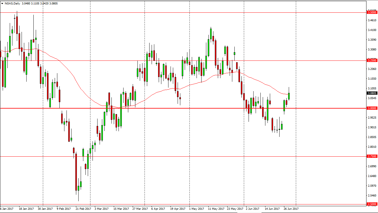 Natural gas markets rallied during the day, but you can see gave back about half of the candle. By forming a bit of a shooting star, I think that if we can break down below the bottom of the candle for the day, the market should go looking for the $3 level, and then the $2.91 level under that. The longer-term trend is to the downside, and I am still looking to sell as there is a massive oversupply issue when it comes to the natural gas markets. Yes, we do get a little bit of a rally due to the outlook for US temperatures going higher, but in the end, it’s a structural problem that the market is no bullish scenario at all. I believe that selling rallies that show signs of exhaustion will continue to be the way most players in the market approach this situation, and therefore I don’t have any interest in buying and believe that the real money is still going to be made to the downside.