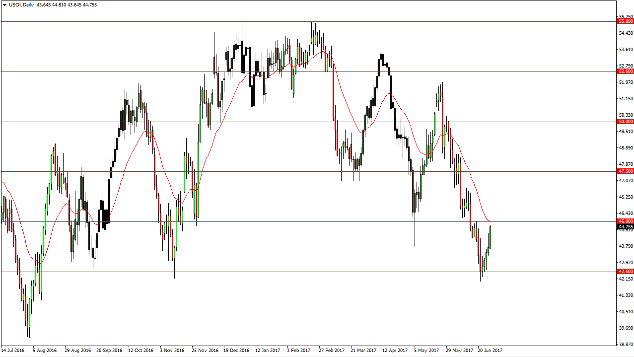 The WTI Crude Oil market rallied during the day on Wednesday, breaking above the top of the shooting star from the previous session. We are approaching the $45 level, an area that of course has a certain amount of psychological significance, and of course the 50-day exponential moving average. The fact that we close to the very top of the range for the day is a very bullish sign, but we are in a longer-term downtrend. With that in mind, I am a seller only. I’m looking for signs of exhaustion to start taking advantage of, as the oversupply continues to be an issue when it comes to oil. Once I get and exhaustive daily candle, I am short of this market and aiming for the $42.50 level again.