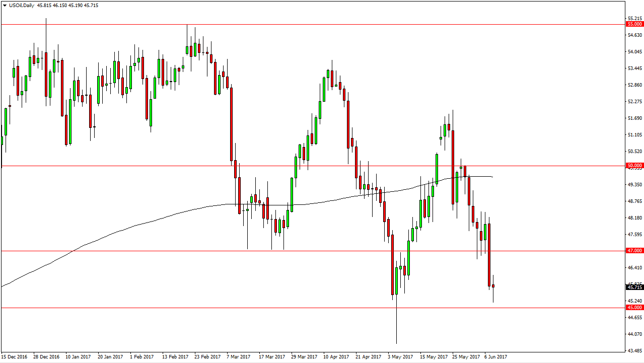 The WTI Crude Oil market had a volatile session on Thursday, going back and forth several times. We ended up forming a bit of a hammer, and this hammer sits on top of the psychologically important $45 level. Because of this, I would not be surprised at all to see some type of bounce, but that bounce will more than likely only be met with significant selling pressure. Given enough time, I believe that the markets will find the $47 level to be too much to overcome, and therefore I’m looking to sell in that general vicinity. I believe that the markets will continue to be extraordinarily volatile, but more than anything else: bearish.