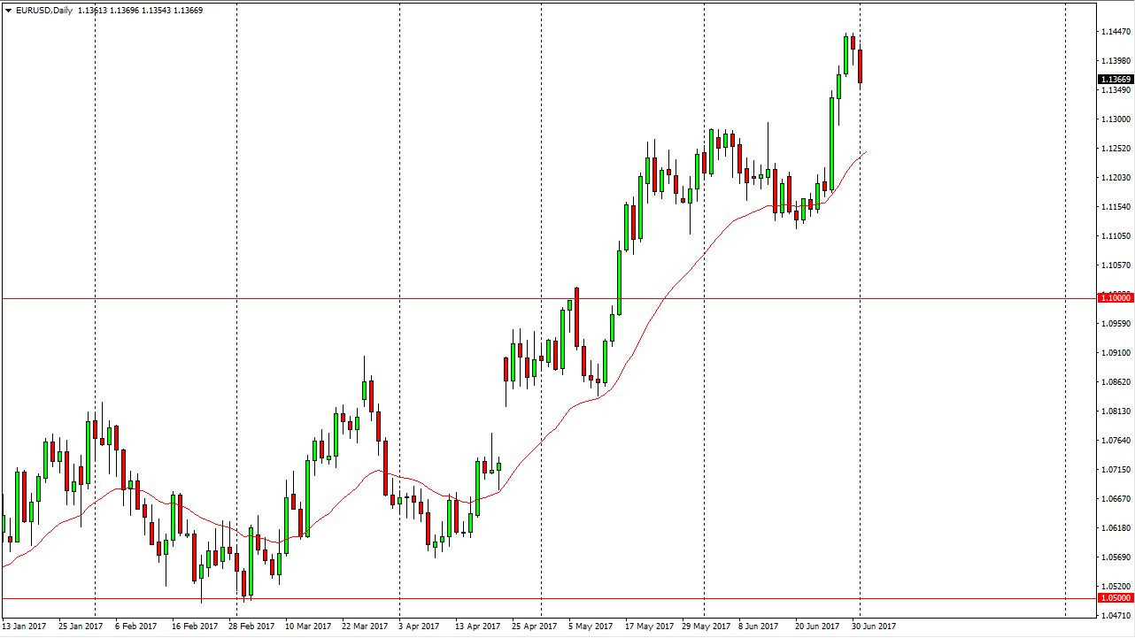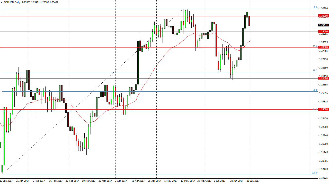 The British pound fell as well, as the 1.30 level has offered resistance. The fact that we closed towards the bottom of the range tells me that the market will probably continue to go lower and the short-term, and I think the 1.29 level will be the next support level. Once we break down below there, I believe that the market would probably go looking for the 1.28 handle underneath. Alternately, if we can break above the 1.3050 level, the market should then go to the 1.3450 level after that. The market has been very bullish as of late, so a pullback makes quite a bit of sense, especially considering the impulsivity of the move over the last several sessions.
