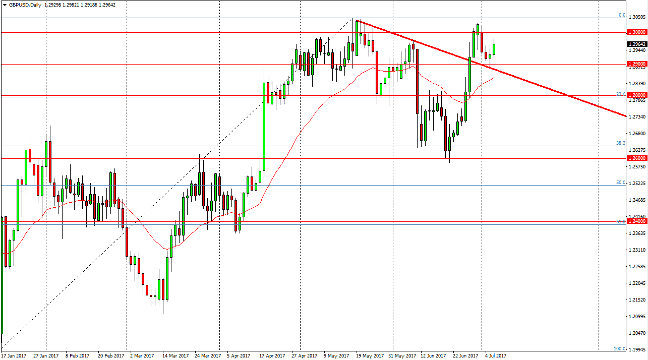 The British pound rallied during the day on Thursday, as we bounced off the downtrend line during the previous session. It looks as if the market is trying to test the 1.3050 level above, and once we get above there, the market should continue to go much higher, the 1.3450 level being my longer-term target. Today of course will be very important, so the daily close will matter. In fact, I believe that we could be setting up for a longer-term “buy-and-hold” situation, and if we do, waiting until the end of the day might be okay as you have a huge upside potential. If we broke down below the 1.29 handle, and more importantly, the downtrend line, the market should reach towards the 1.28 handle. Either way, this market will be very choppy during the day, as this market will be reacting to the interest rate outlook coming out of the United States.