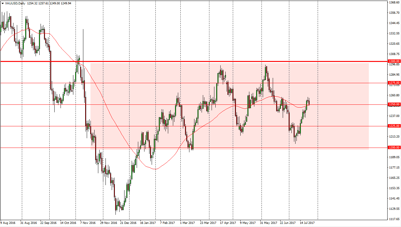 Gold markets had a slightly negative session during the Tuesday session as we crashed back towards the $1250 level. We had formed a shooting star during the day on Tuesday, which show signs of negativity. However, today is the FOMC Interest Rate Statement coming out, as well as the actual decision. I believe that the market should continue to see volatility. Quite frankly, today is going to be difficult to trade, but I would point out that the 50-day exponential moving average is just below current trading and is testing the $1250 level itself. With this being the case, I expect to see a lot of volatility during the day with the headlines coming out. Because of this, I have a reasonably wide range of consolidation, but once we break out of it, I more than willing to put money to work.