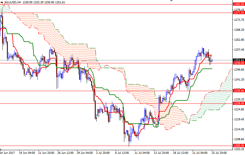 The market is currently trading within the borders of the hourly Ichimoku cloud and it appears that prices will continue to trade within a relatively narrow range until the FOMC announcement. The support at around 1250 initially held but the tall upper shadow on the 4-hourly candle suggests that it is still in danger. If the bears capture this camp, prices will probably retreat to the 1247/6 area, where the Kijun-Sen (twenty six-period moving average, green line) sits on the H4 chart.