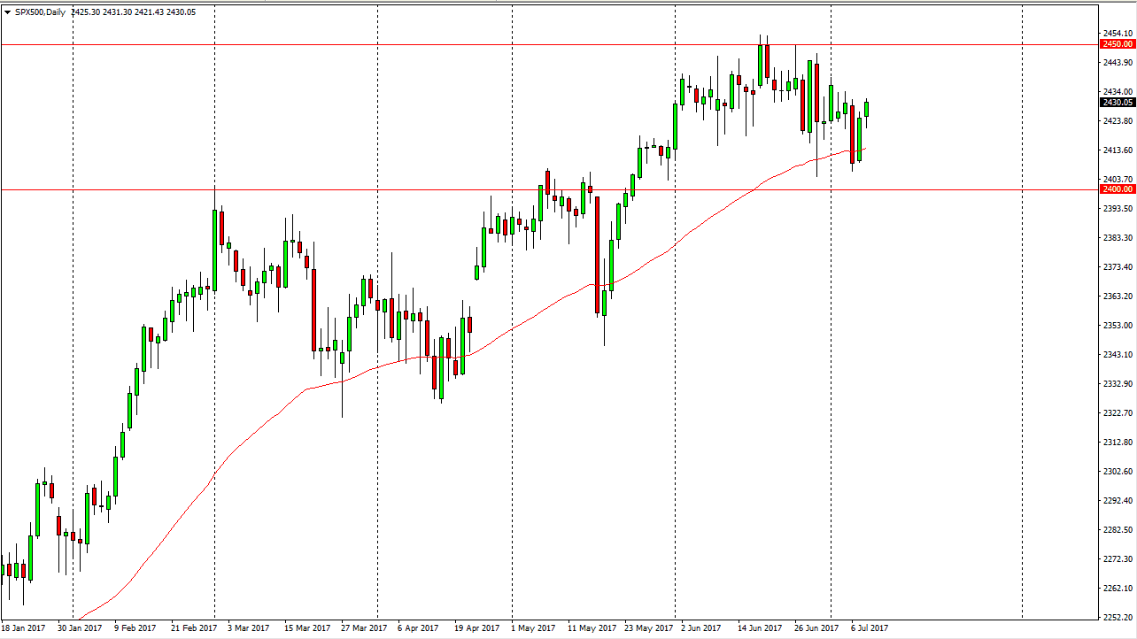 The S&P 500 initially fell on Monday, but found enough support underneath to bounce and reach towards the 2430 level. The market looks likely to continue to grind to the upside, perhaps trying to reach towards the 2450 handle above. A break above that level would send this market to the 2500 level, which is my longer-term target. This market continues to be one that find support every time it falls, so with this being the case it’s likely that buyers will return repeatedly. Because of this, the market will probably be very volatile, but I still believe that the upward momentum and bullish pressure will continue. The 2400 level should be massively supportive and essentially a “floor” in the market.