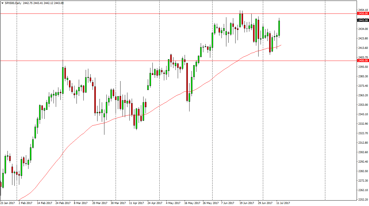 The S&P 500 had a strong showing on Wednesday as the Congressional testimony of Janet Yellen assured traders that although there will be interest rate hikes in the near future, they will be gradual and data dependent, which of course means that the Federal Reserve is very cognizant of how fragile the markets could be. Because of this, it looks as if the S&P 500 is trying to break out, and I believe that the market will look for reasons to try to overcome the 2450 handle. Once we do, the market should then go looking towards the 2500 level which has been my longer-term target for quite some time. When you look at this chart, the 50-day exponential moving average has offered significant support, and at the same time you can make an argument for an uptrend in channel, both of which are very bullish.