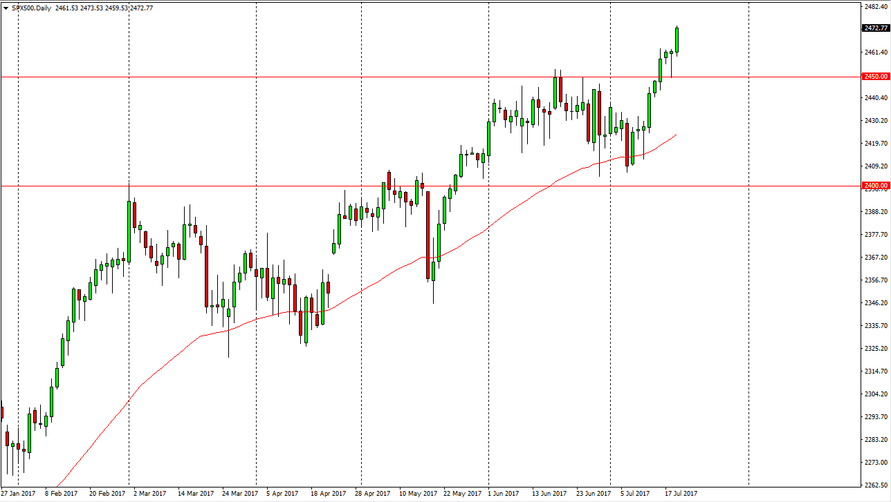 The S&P 500 broke to the upside during the day on Wednesday, clearing the top of the hammer that formed on Tuesday. It now looks obvious that we are going to go looking towards the 2500 level, which is a psychologically significant level. It’s been my longer-term target for quite some time, but we can also make an argument that we are getting close to the top of an uptrend in channel, so it is possible we get a pullback. Those pullbacks should be value, as this is obviously a very bullish market. I’ve no interest in shorting, and I believe that the 2450 level now offers a significant floor in the market that should continue to lift things going forward.