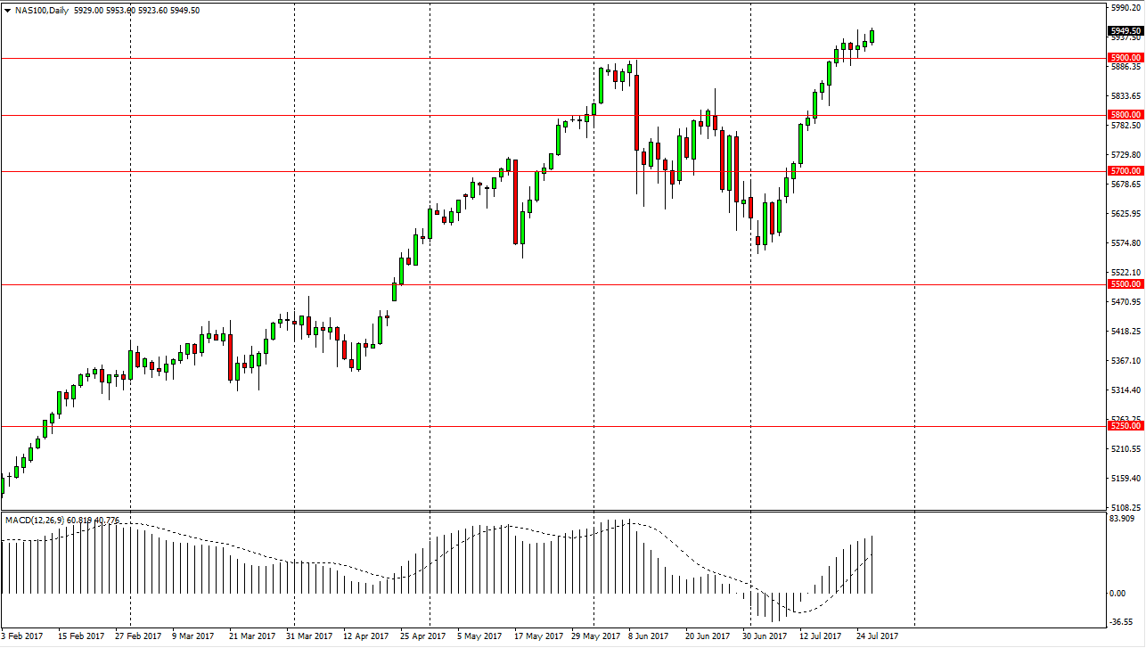 The technology sector did very well during the day, as we broke towards the 5950 handle. It looks likely that the market will then go looking for the 6000 level and it’s probable that the NASDAQ 100 will lead the way for the rest of the European indices. I also believe that there is a bit of a “floor” in this market, near the 5900 level. Because of this, I don’t look at pullbacks or negativity as a reason to sell, it makes me start looking for value below on signs of support. Eventually, we should break above the 6000 handle, but it will take a certain amount of momentum building to get there. We have rallied so much as of late, it does not surprise me that we are struggling to make that break out currently.