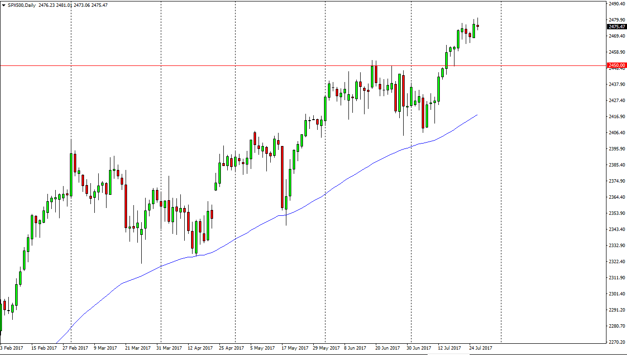 The S&P 500 initially was slightly negative during the day on Wednesday, but as the Federal Reserve FOMC statement was coming due, buyers started pushing the S&P 500 higher. Later in the day, we pulled back, as traders would have taken risk off ahead of the volatile announcement. However, when I look at this market we have ended up forming a shooting star for the daily candle which causes a bit of concern. I don’t think we’re going to turn around, but with the Federal Reserve talking about concerned with inflation, perhaps we are starting to see a market that needs to pull back. I think there is a significant amount of support below the 2450 handle, so I think we are going to drop any more than 25 handles. I think that a pullback is healthy, and should offer a buying opportunity underneath as we will need to build up momentum to finally break above the 2500 level.