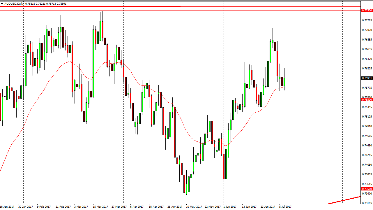 The Australian dollar initially tried to rally during the day, but turned around at the 0.7625 level to turn around to form a bit of a shooting star. I think there is plenty of support below though, so I’m not necessarily interested in trying to short this market yet though, because I think there’s plenty of support near the 0.7550 level. Ultimately, the market looks likely to continue to be volatile, but I think that the markets will focus on a lot of different things, not the least of which is gold which seems to be very soft. If we broke above the top of the range for the day on Friday though, I think that’s a very bullish sign and we could go to the 0.77 handle. Either way, I think this is a very volatile market and quite frankly I’m not overly interested in putting a lot of money into the Australian dollar as the central bank is essentially very neutral.