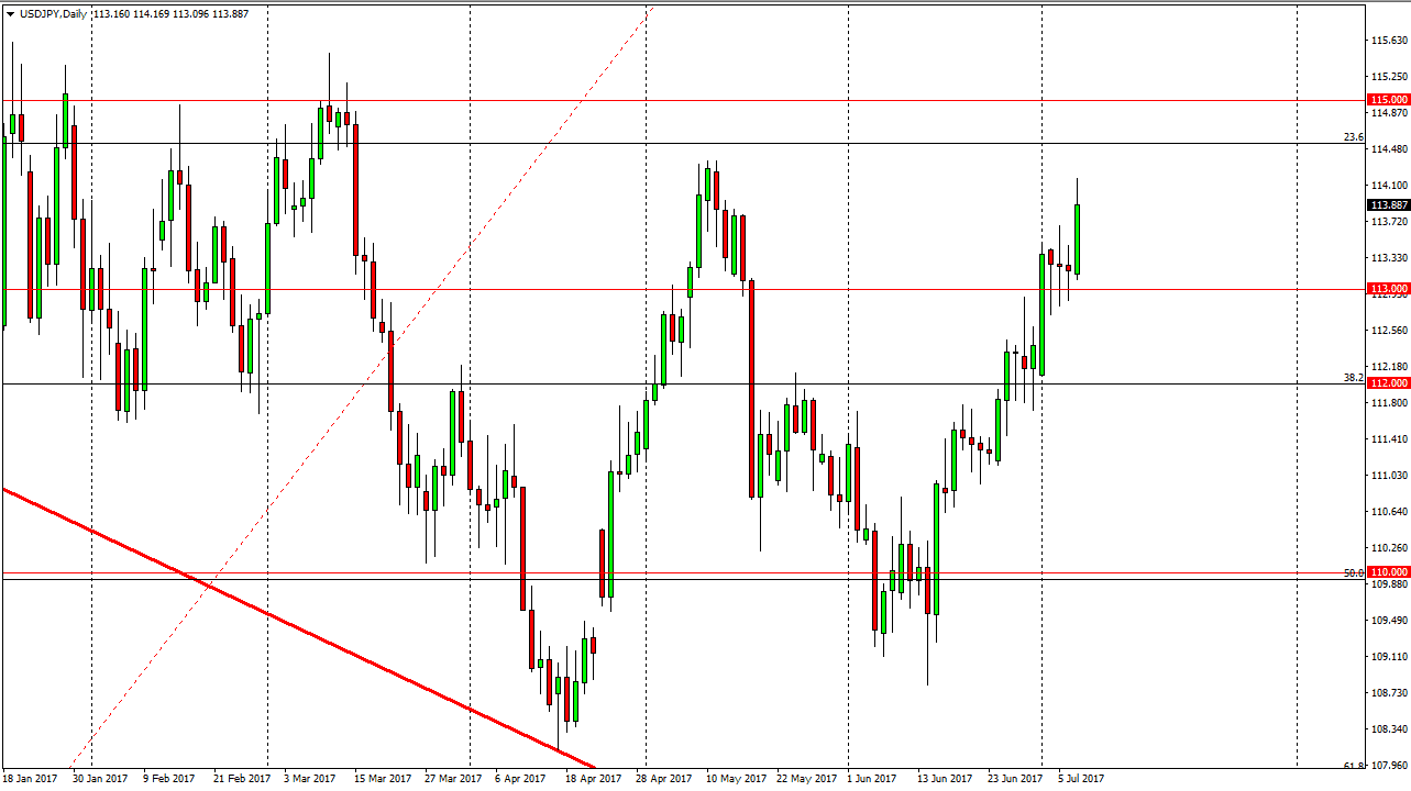 The US dollar rallied during the day on Friday, as the jobs number was better than anticipated. This have the USD/JPY pair reaching above the 114 level. The market looks likely to pull back, but at this point I think there’s plenty of support near the 113 handle. The 115 level above is massively resistive, but ultimately if we can break above there, the longer-term uptrend will continue to the upside. I think that this is a “buy only” market, so I’m buying the dips as they appear. Even if we break down below the 113 handle, I think the 112-level underneath is even more supportive. The bond markets are starting to spread interest rates between these 2 a little bit wider, and that tends to favor the US dollar as US interest rates are rising while Japanese interest rates remain ultralow.