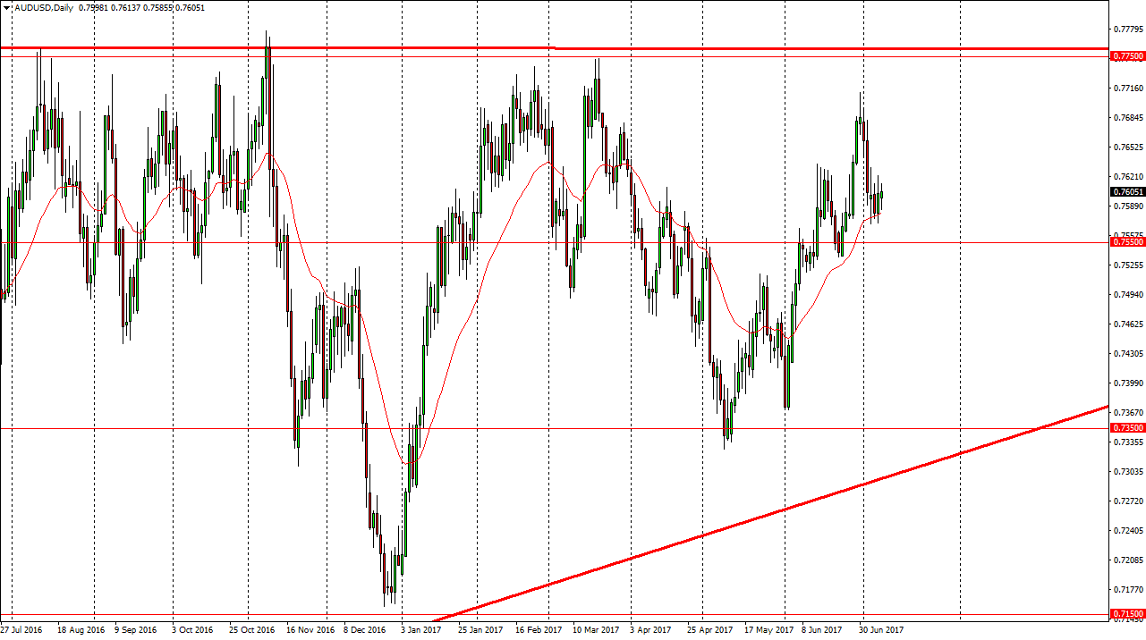 The Australian dollar did almost nothing during the day on Monday, as we continue to see a lot of volatility in a market that is going back and forth in a 20-point range overall. The 0.76 level seems to be a magnet for price, so I think we will probably continue to see buyers and sellers both jump into this market place with little in the way of conviction. The 0.7750 level above will be the target, but I recognize that it won’t be easy. If we can get gold to rally, it could help the Australian dollar, but right now it looks very likely that gold will continue to struggle in general, and that should continue to weigh upon the Australian dollar. Quite frankly, it’s difficult to imagine being involved in any of the so-called “Comm Dolls”, as both the Australian dollar in the New Zealand dollar look flat.