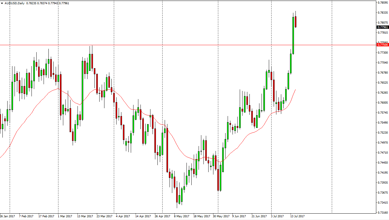The Australian dollar as you can see initially tried to rally during the day on Monday, but fell backwards as it appears that the market will have to build up momentum to continue going higher. That being the case, I am not interest in selling this market, and I suspect that the buyers will return near the 0.7750 level. On some type of supportive candle, I am going to be the long of the Aussie dollar, especially if gold markets rallied. Ultimately, I think that the market could go looking for the 0.80 level above, as it has been a magnet for price on longer-term charts, not only the recent past, but decades before. If we break down below the 0.7675 handle, the market should then breakdown from there and go looking to the 0.75 handle. Ultimately though, I believe that the buyers are probably going to run the market much higher over the longer term.