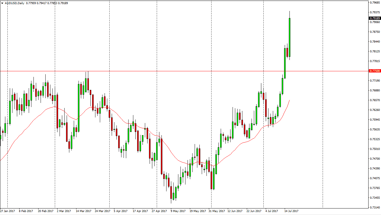The Australian dollar broke higher during the day on Tuesday, reaching towards the 0.7925 level. We close towards the top of the range, so that tells me that it’s a nice move the has real potential in it. Because of this, I am a buyer of pullbacks as long as we can stay above the 0.7750 level as they represent value. Pay attention to gold, it’s very likely that continue to go higher, the Australian dollar will continue to rally as well. It is not until we break down below the 0.7750 level that I would consider selling, and even then, I would have to evaluate the situation. I think the buyers will probably continue to reach towards the 0.0 level above, which is a large, round, psychologically significant number. It will probably take several attempts to break above the 0.0 level, but once it does, this market could really take off her a longer-term move. The US dollars on its back foot against most currencies, and the Aussie is suddenly finding itself in favor.