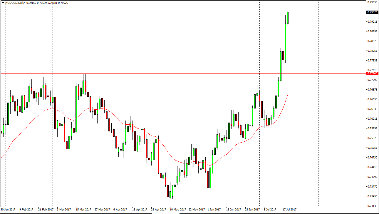 The Australian dollar continued its moved to the upside during the Wednesday trading session, reaching towards the 0.7950 level. We are overextended by just about any metric you measure the pair with, so having said that I think that a pullback is necessary. I still believe in buying though, and I think that the 0.7750 level underneath should be massively supportive. I also recognize that the market has been a bit overextended, so it’s difficult to imagine that it will be able to break above the 0.80 handle anytime soon. With this being the case, I believe that you should pay attention to gold, as it will give you an idea as to where the Australian dollar will go next. After all, the 2 markets are highly correlated, and certainly seem to be at the moment. I think pullbacks offer value, and I think that value will continue to be bought by traders around the world. Keep in mind that a weaker US dollar list gold prices, which of course lifts the Australian dollar.