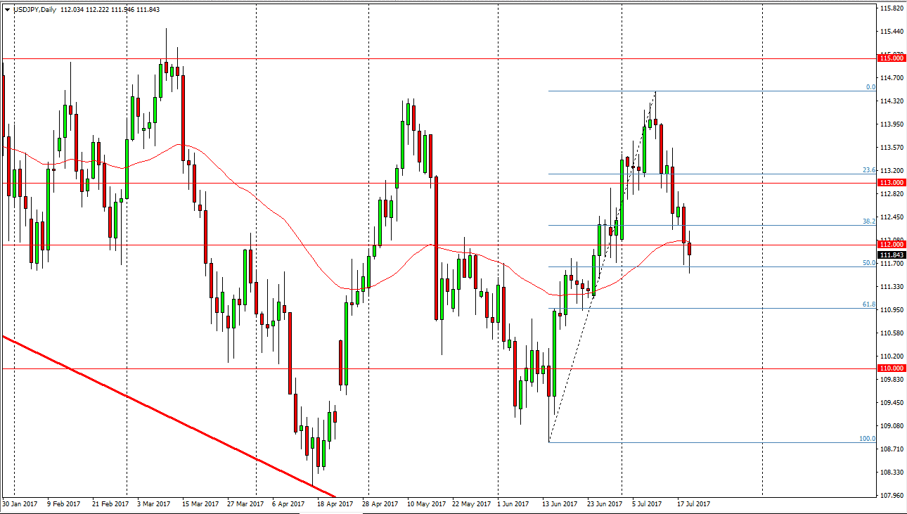 The US dollar had a volatile session on Wednesday against the Japanese yen as we sliced below the 112 level. We have found a bit of support at the 50% Fibonacci retracement level, so it’s likely that we could bounce from here. A break above the top of the candle for the session has this market going much higher, perhaps the 113 handle, maybe even above there towards the 114.50 level. This being the case, the market will more than likely become bullish on a move higher, as we will see value hunters in her the marketplace. Alternately, if we break down below the candlestick for the Wednesday session, I think we then go to the 111 level, which is the 61.8% Fibonacci retracement, and then possibly even down to the 110 handle.