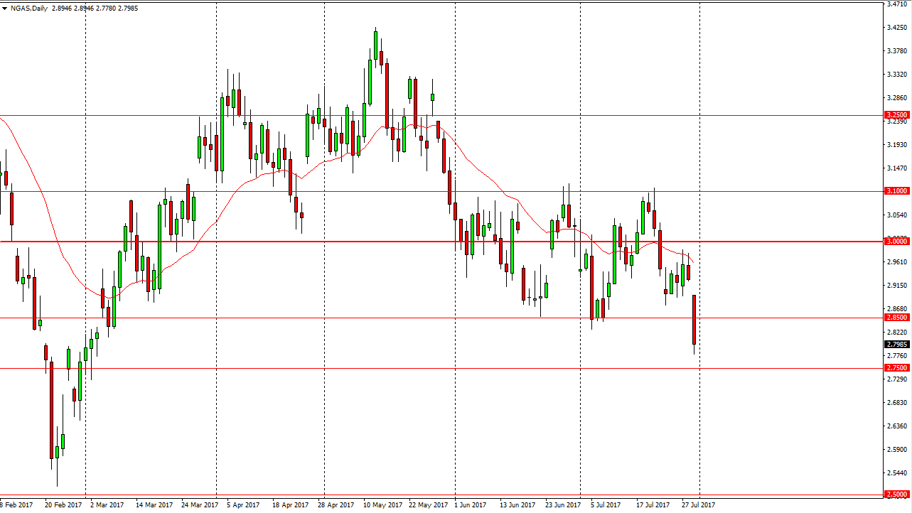 Natural gas markets gapped lower at the open on Monday, and then sliced through the $2.85 level. In fact, we almost got down to the $2.75 level, which was my next target. I believe that any rally from here will run into a significant amount of resistance. Ultimately, if we can break down below the $2.75 level, the market should then go down to the $2.5 level after that. This is a market that is very negative, because we are so oversupplied. While it is possible that rising crude oil, prices could bring in a bit more demand for natural gas, the market is far from turning around at this point. Because of this, I continue to sell short-term rallies that show signs of exhaustion, as I believe that the bearish pressure will not only continue, but it’s very likely that I will increase from this point on. I believe that there is a massive ceiling in the market just above the $3 level, extending to the $3.10 level.
