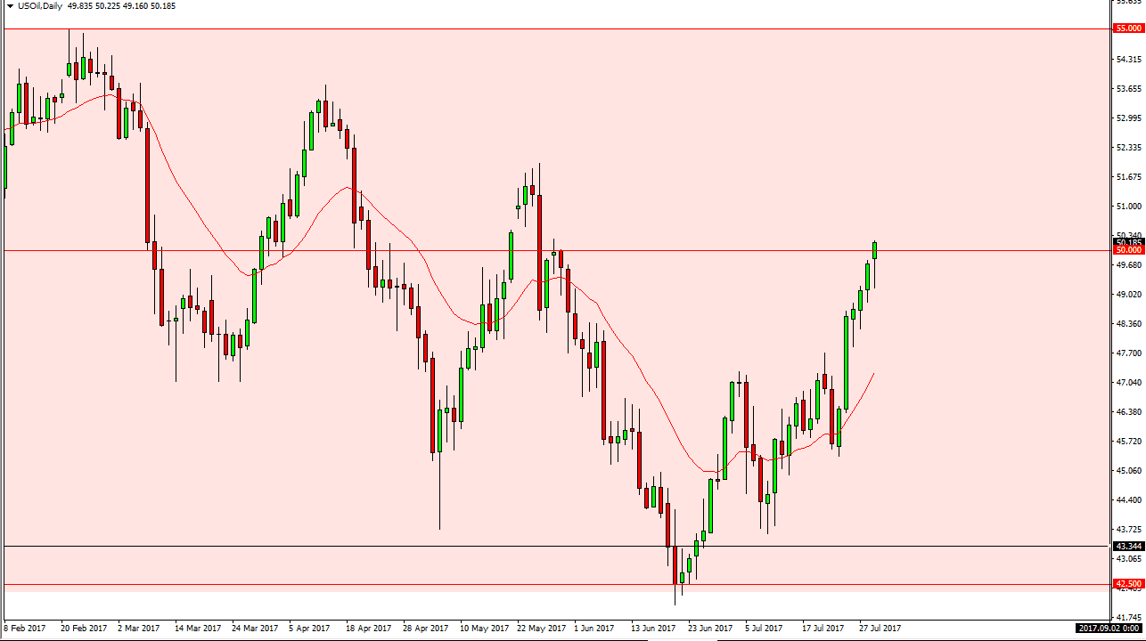 The WTI Crude Oil market gapped higher on Monday, but then fell towards the $49 level. We found enough buyers in that area to break above the $50 handle finally, and ended up forming a bit of a hammer for the day. This suggests that there is plenty of buying pressure underneath, although we are bit overextended. At this point, it appears that the oil markets are trying to break out to the upside and reach towards the $52.50 level. I believe that the $55 level above there is the top of the overall consolidation, so sooner, rather than later, I think that we will have sellers come back into this market. However, and the short-term it is obvious that this market is very bullish.