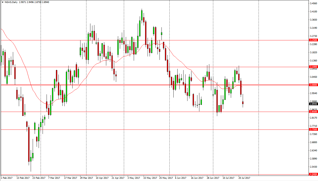 Natural gas markets gapped lower at the open on Monday, but then bounced enough to fill the gap. The shooting star that formed for the day suggests that we are going to go looking for the $2.85 level, and I think that it’s only a matter of time before we get there. Ultimately, the market should break down below the $2.85 level and go looking towards the $2.75 level. I have no interest in buying, as the $3.00 level above should be massively resistive. That is an area that I think Sirs a significant amount of psychological resistance, but even if we break above there I think the top of that resistance is closer to the $3.10 level. There is for too much in the way of oversupply, and I think that will continue to work against the value of this market.