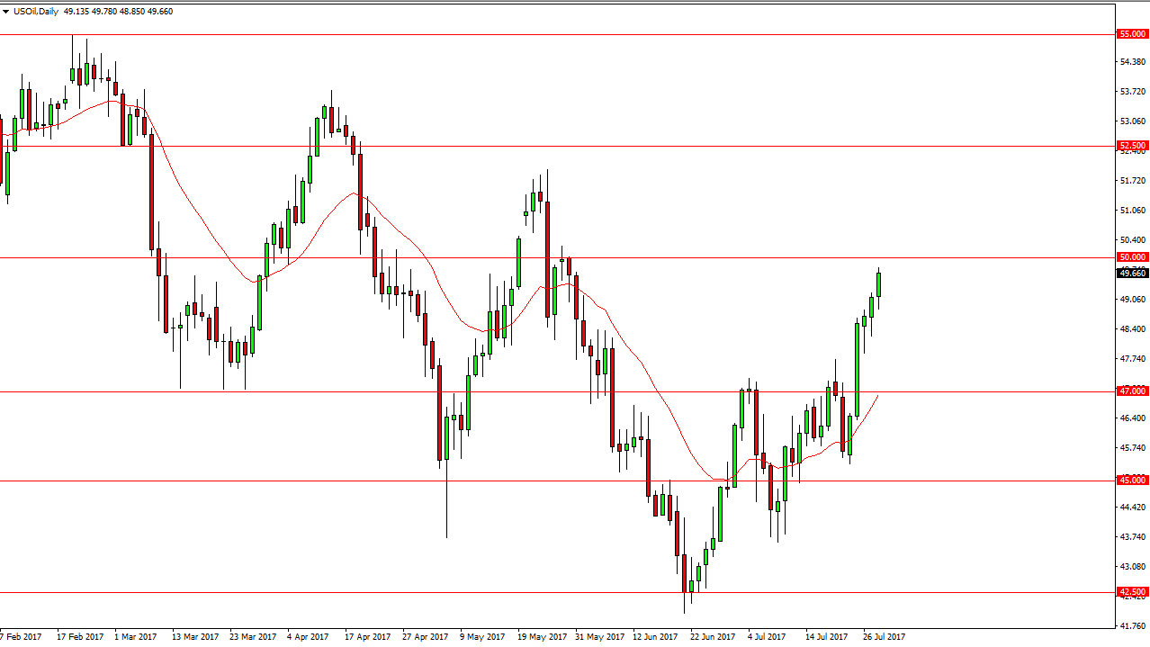 The WTI Crude Oil market fell slightly during the day on Friday, but turned around to show signs of support. Ultimately, this market looks as if it is going to reach towards the $50 level, as it is a large, round, psychologically significant number. This is an interesting turn of events, because I believe a lot will be decided at the $50 handle. If we can break above there, the market probably goes looking towards the $52.50 level. Alternately, and exhaustive candle could be a nice selling opportunity as we have gotten a bit overbought. Longer-term, I am bearish but I also recognize that there are a lot of noises out there in the market that will continue to move oil.