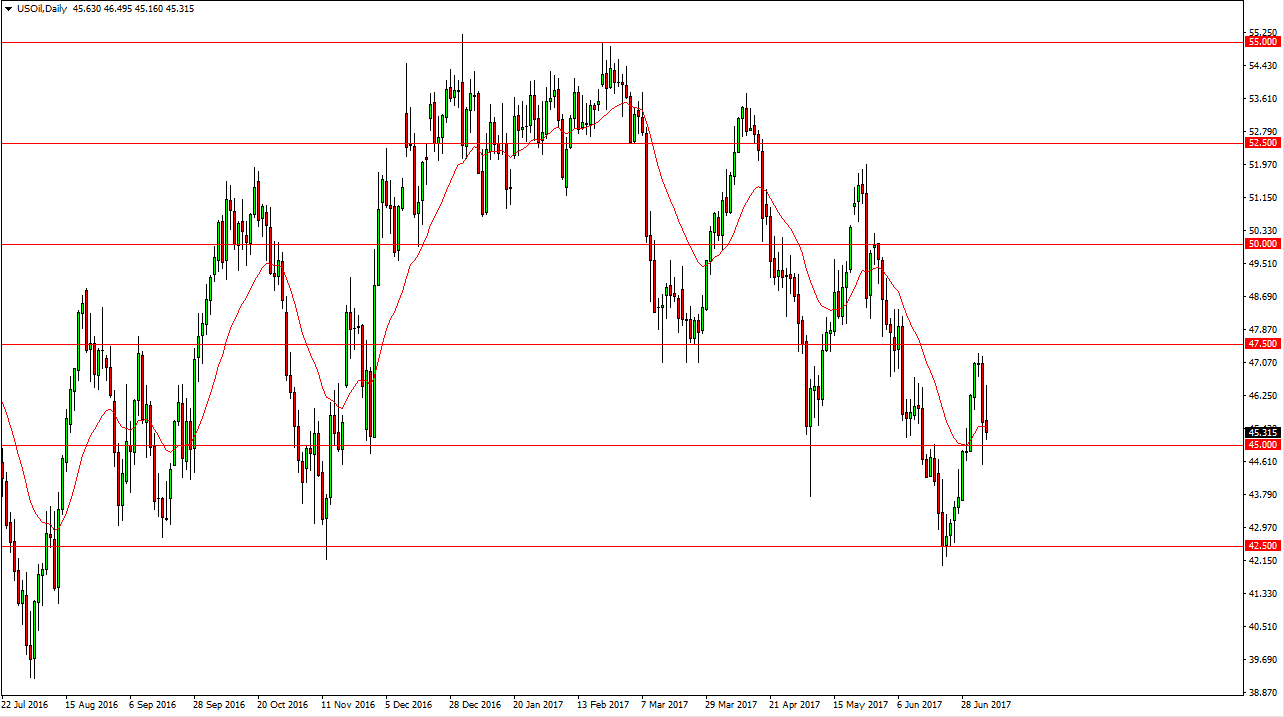 The WTI Crude Oil market initially tried to rally during the session on Thursday, as we had a stronger than anticipated withdrawal of crude oil inventory announced. However, I think that the market will eventually break down below the $45 level, and when it does it’s time to start selling again. The jobs number of course will have an influence on what happens with the oil markets as it influences on the US dollar. The stronger the US dollar, typically the more pressure that we see in this market. The $42.50 level is my next target, and if we rally from here, I think that signs of exhaustion should be selling opportunities as well. I have no interest in buying this market, and I believe that the $47.50 level above is massive resistance.