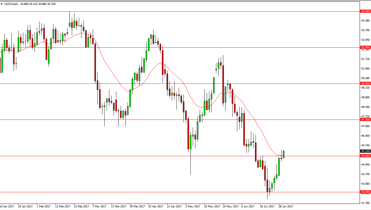 The WTI Crude Oil market broke above the $45 level during the day on Friday, testing the top of the shooting star from Thursday. The shooting star from Thursday is a very negative sign, and it is also on the 50-day exponential moving average. If we can break down below the bottom of the Thursday candle, the market should then go down to the $42.50 level. This is a market that continues to suffer from oversupply, so I think selling is the only thing you can do. Even if we can break above the top of the shooting star, I think that simply waiting for and exhaustive candle is how to go forward, and I am very bearish in this market. Simple patience will be needed to take advantage of the massive downtrend.