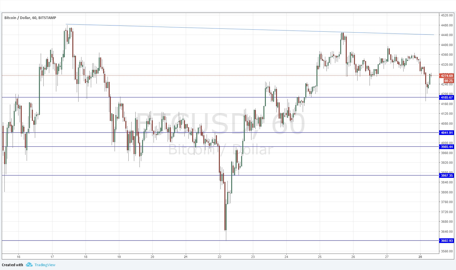 The long-term outlook and trend are certainly bullish, and new all-time high prices look probable over the next week or so. However, for two weeks now the price has remained within a wide range, and a gently bearish trend line can even be drawn connecting the two recent major swing highs. If the price fails to make a new high beyond these soon, and if the support levels at $4185.67 and $4041.91 do not hold up, this will be a sign that the pair is due a deeper, major bearish correction.