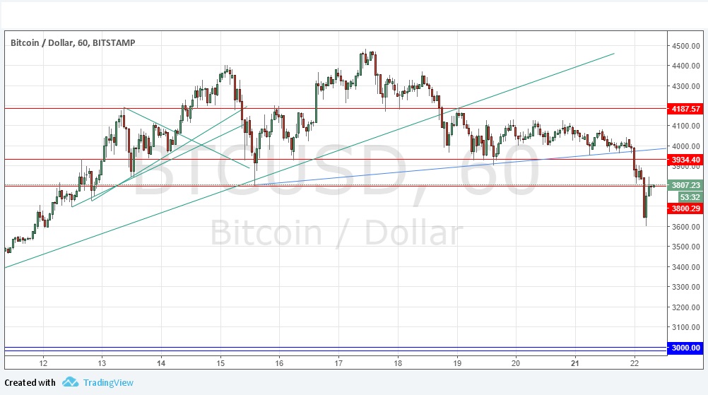 Bitcoin has reached an important moment. This does not quite look like a bursting of a bubble yet, but it is getting closer. The price fell by more than 10% in a few hours beginning close to the end of yesterday’s New York session. Although there has been some recovery from the low with a possible double bottom holding at $3600.00, the fact that support levels below $4000.00 have decisively broken down should be of grave concern to buyers still holding long-term long positions. The closest resistance level, which is new, is at $3800.00, and so far as the London session gets underway, it is holding as resistance – another bad sign for bulls. I think it will not hold, and the real test will be the resistance level at $3934.40, which could give a good short opportunity later if the price bounces there. Today is probably not going to be a good day for buying.