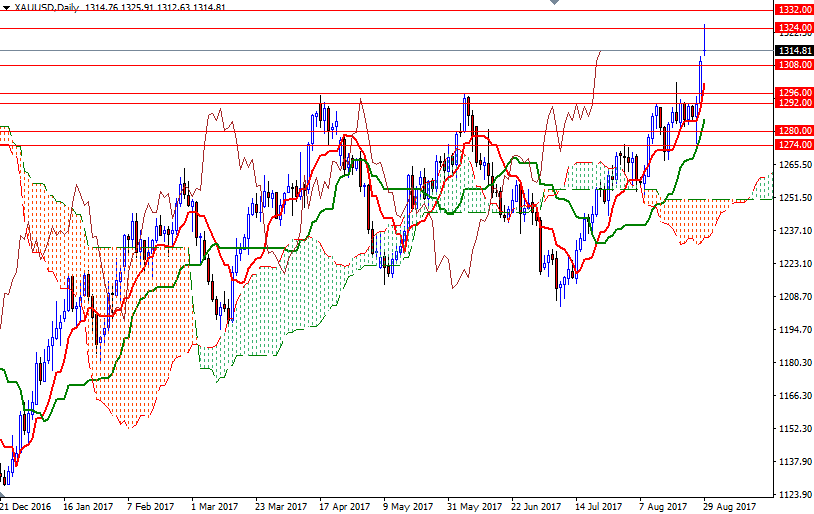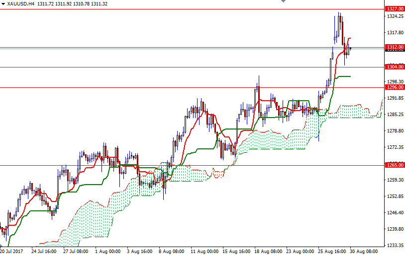 While world stock markets reversed some of the steep losses witnessed earlier in the day, gains in the dollar weighed on the precious metals. Investors are now looking to Friday's U.S. non-farm payrolls data. From a chart perspective, trading above the Ichimoku clouds suggests that gold is likely to maintain bullish trend over the medium term. However, the market may remain range-bound (between 1327.50-1324 and 1296-1292) ahead of the release of the August jobs report.