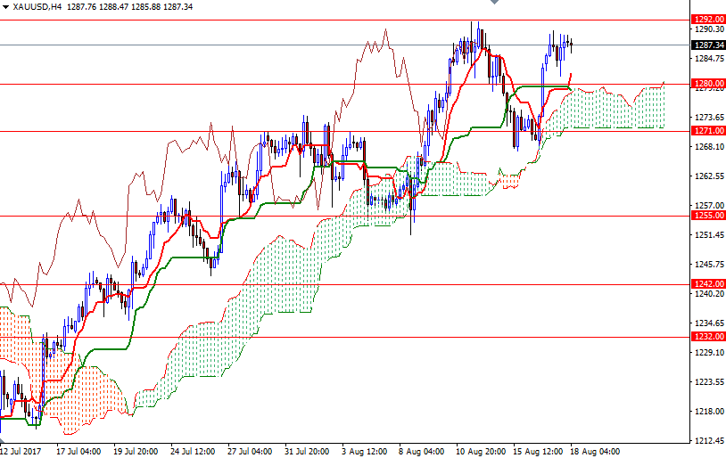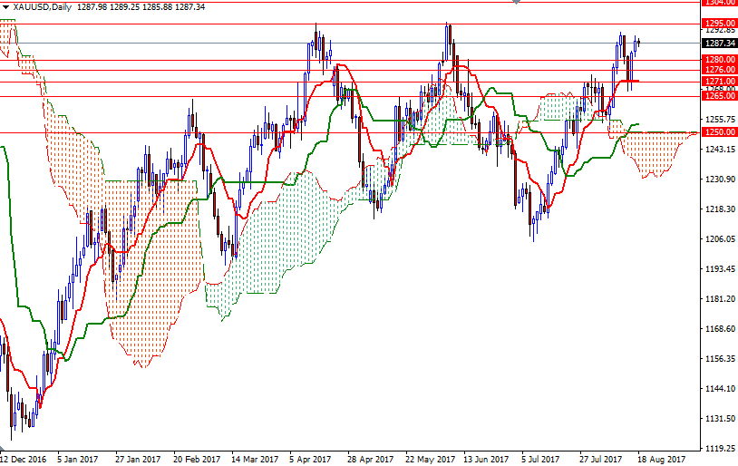 However, if the bears increase pressure and drag prices below 1280, then the market will probably revisit the 1276/5 zone. A break below there could send prices back to the 1271 level, the confluence of a horizontal support and the daily Tenkan-sen (nine-period moving average, red line).