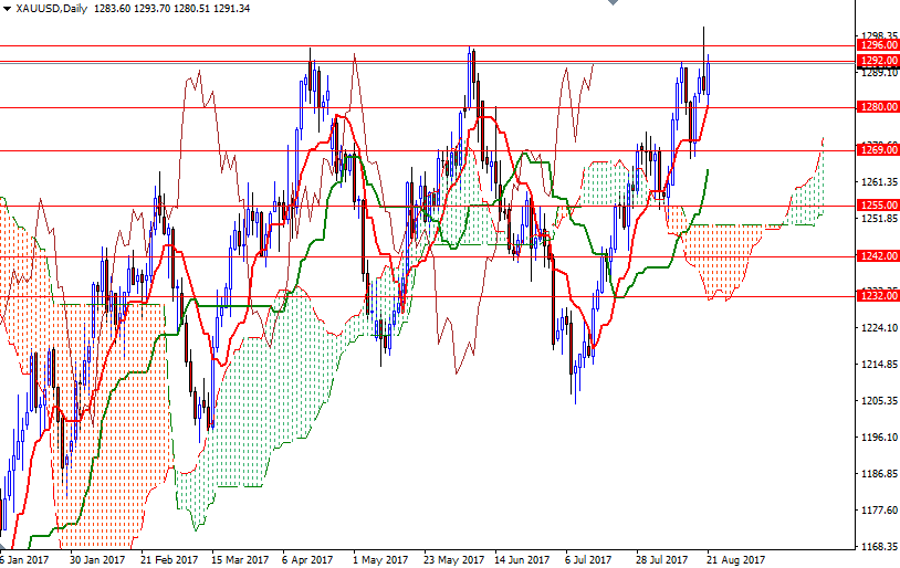 XAU/USD initially tested the support around the 1280 level before heading higher. The bulls still have the overall technical advantage, with the market trading above the Ichimoku clouds on all time frames (except the monthly chart). However, on top of us there is an anticipated resistance zone that stretches from 1292 to 1296 and the market is currently stalling in this area.