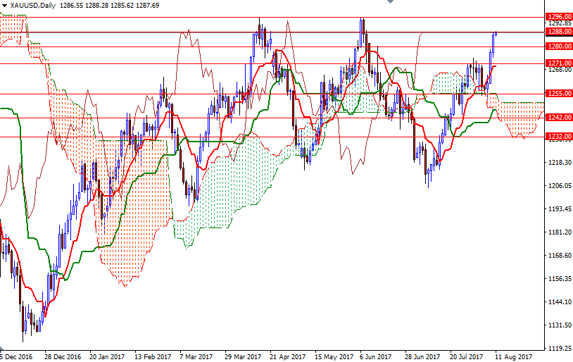 Gold prices rose $9.30 an ounce on Thursday, extending their gains to a third-straight session, as geopolitical risks hit equities and the dollar index fell. The greenback weakened after the Labor Department said its producer price index slipped 0.1% in July and the number of people filing new claims for unemployment benefits climbed by 3K to 244K. XAU/USD is currently trading at $1287.69 an ounce, slightly higher than the opening price of $1286.55.