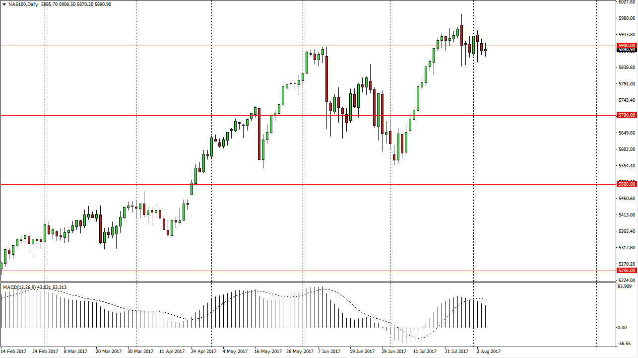 The NASDAQ 100 has gone back and forth just underneath the 5900 level, and I think that the market is currently just trying to digest a lot of the gains that we have recently had. After the impulsive move that we had in the NASDAQ 100, it makes sense that we need to take a little bit of a break. I believe in buying dips, but I also recognize that it might be a while before we get any real momentum in the market. I believe that the 5700 level underneath offers a significant amount of support, and it will be difficult to break below there. I think the given enough time, the market should then go looking for the 6000 level above.