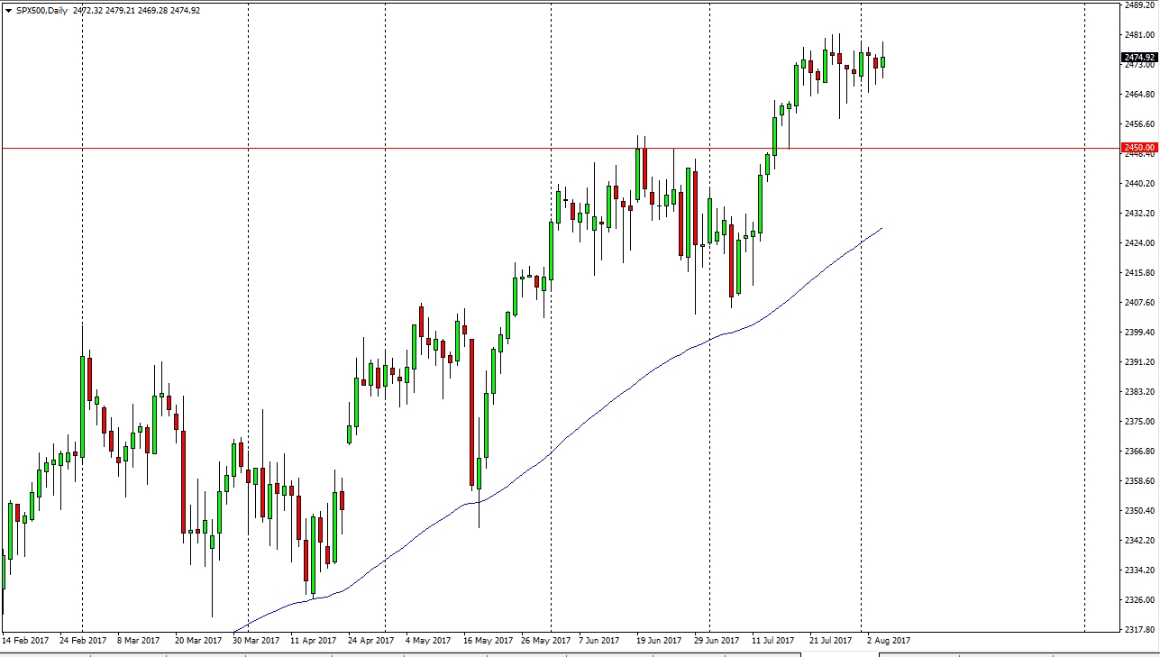 The S&P 500 went back and forth during the day on Friday, as the jobs number rattled the market. The jobs number was much better than anticipated, and this brings on 2 schools of thought: either the Federal Reserve will raise interest rates and that could work against the value of stocks, or perhaps the economy is getting better. With both of these forces working in the market, it’s not overly surprising that we went sideways. I think we continue to grind sideways, and that a short-term pullback could happen. However, the 2450 level should be a bit of a floor, and should push this market higher and towards the 2500 level. I’m a buyer overall and have no interest in shorting.