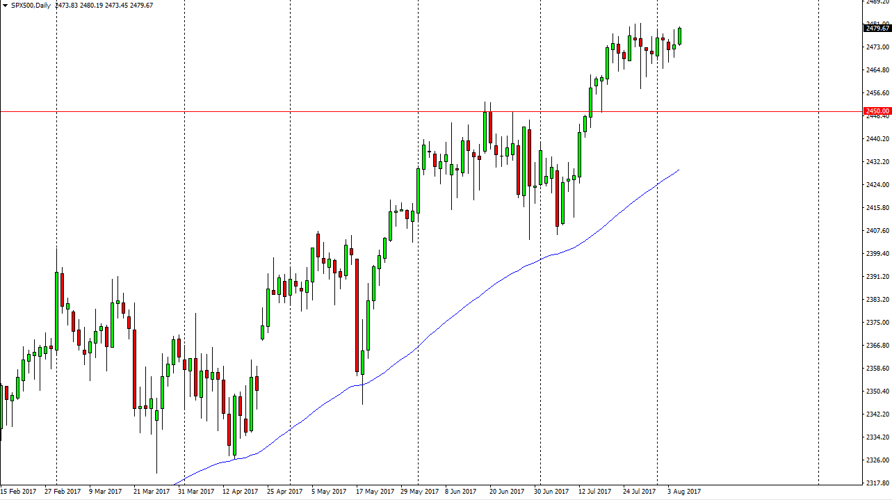 The S&P 500 rallied during the day on Monday, breaking above the top of the shooting star like candle from Friday. This is a very bullish sign, but I recognize that there is still a lot of noise above, and extending to the 2500 level at the very least. I believe the pullbacks are buying opportunities, and that there is a significant amount of support near the 2465 handle. There’s even more support below at the 2450 handle, and I believe that the uptrend is essentially enjoying a “floor” at the 2400 level. I have no interest in shorting this market and believe that eventually we will manage to build up the momentum necessary to break above the 2500 handle. Once we do, becomes more of a “buy-and-hold” market.